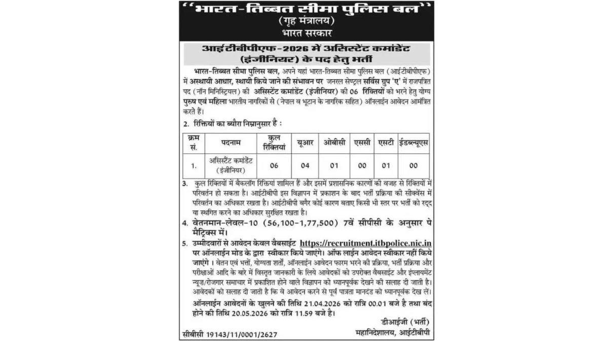 नोट: कृपया अधिक सटीक जानकारी के लिए इस आईटीबीपी असिस्टेंट कमांडेंट नौकरी के लिए प्रकाशित आधिकारिक ITBP Assistant Commandant Bharti 2026 अधिसूचना को जरूर देखें।